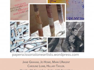 Informal meetings over time have developed into something special for five Hertfordshire artists whose work centres around paper. A binding group principle is to ensure high quality visitor experiences, events or exhibitions in response to the space, ethos and values of a host setting. Initially this collaboration led to a highly rated four-artist group exhibition in February 2015, followed by further exhibitions involving the artists that have been touring galleries throughout 2015. Paper Scissors Stone: Taking Paper Beyond the Page, are title and original theme for their imaginative and thought-provoking body of work based around altered books, interpretations of paper, mixed media, language and much more.