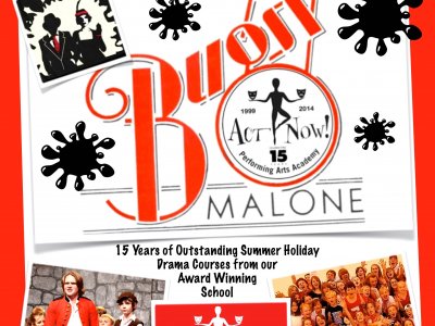 **Book on our Bugsy Malone TEN day summer holiday theatre course by midnight Thursday 26th June for just £157.50. All participants perform in production of Bugsy Malone, three performances, live musicians and splurge guns! Ages 8 to 19. Ten days 9.30 - 4.30 each day at Trestle Arts Base Theatre. 15th year of outstanding, highly acclaimed musical theatre courses from the national award winning Act Now! Price comparison - this is cheaper than most 5 days courses available! Why? Because we want to make it as accessible to as many families as possible. Act Now! Book Now!
