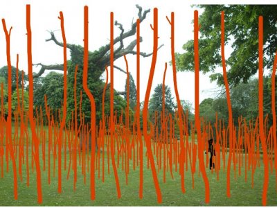 “The installation will draw attention to the beautiful landscape at Cockington.” The piece will change from silver hazel to earth red during the public week, and then over the following six weeks of the exhibition the weather will change the sticks back to hazel.