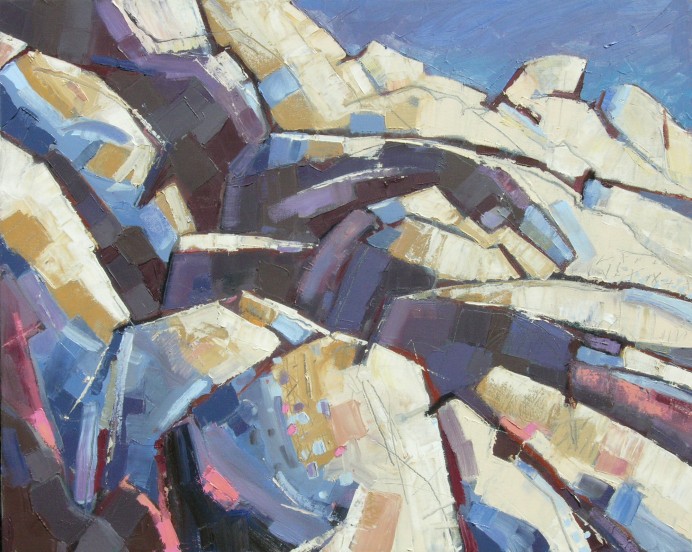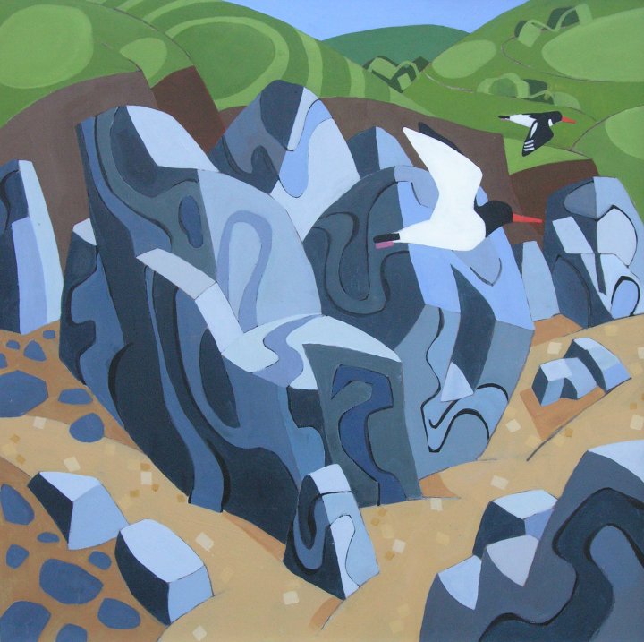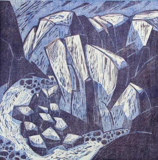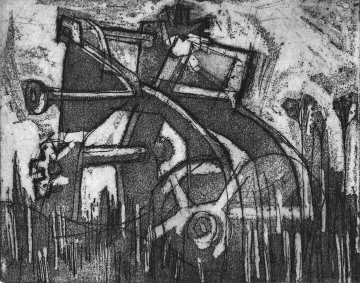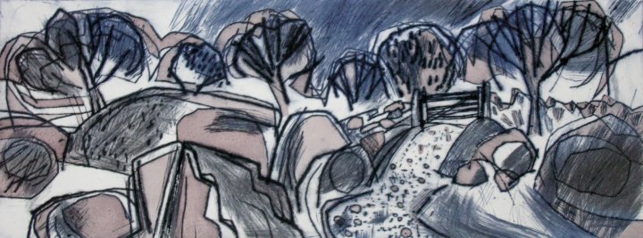 Shoreline and moor are principal devices, and are employed in seeking a personal vision that may take a semi-figurative or abstract form. In each piece I make I need to have discovered something new - in the subject, the process, the medium, and in myself. My time is spent equally between printmaking and painting with occasional forays into assemblage and illustration.