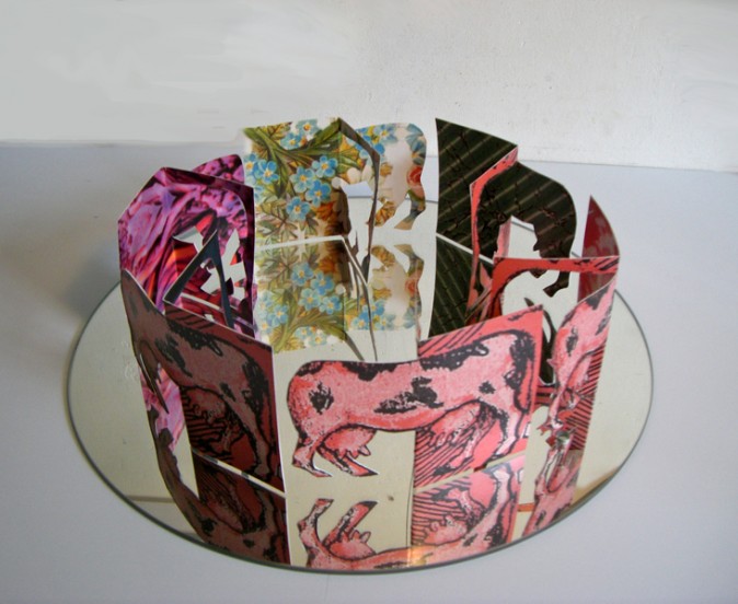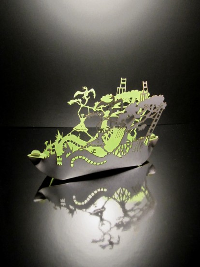 The first prototype boat shape was based on a commercial packaging net, but I repeatedly customised this to produce a range of more complex laser cut vessels. The boat can be seen as a life raft piled high with remnants of lost lands, a salvage vessel or Noah’s Arc. The devil is in the detail however; the imagery reveals that, in our rush to discover pastures new or to escape the exhausted and derelict, we bring with us unwanted passengers, be they stowaways in the form of non indigenous species, viruses, and voracious technologies, or simply our own inadequacies.
