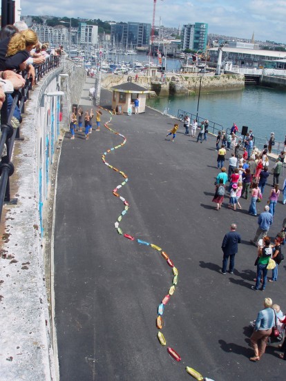 The initial impetus for this work was a commission from Dartington Arts to work with veteran U.S. site specific choreographer Stephan Koplowitz and his company Taskforce for LIQUID LANDSCAPES, a series of water related dance performances in Plymouth in June 2009. I was commissioned to produce a site specific installation of over 300 multi coloured paper vessels to which the dancers responded at the Mayflower Steps. The first designs focused on a simple net shape and were all hand cut.