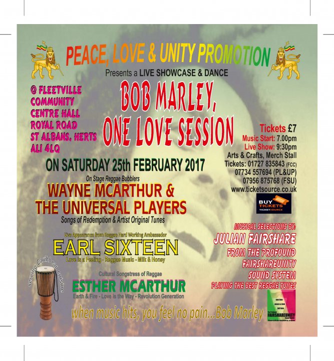 PEACE, LOVE & UNITY PROMOTION SATURDAY 25TH FEBRUARY 2017 @FLEETVILLE COMMUNITY HALL ROYAL ROAD ST ALBANS, HERTS AL1 4LQ TICKETS ENTRY: £5...
