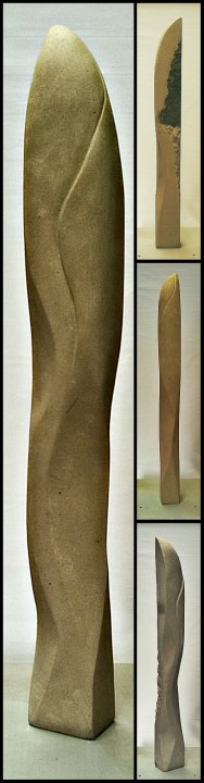 The ellipse makes reference to the Luna Cycle, the waning moon and the undulating forms refer to the ribbed shapes left in the sand by the outgoing tide. Stone is a natural material varied and individual. in this piece I have exploited a natural 'flaw' in the stone to create a two-tone texture to part of the sculpture, reminiscent of a luna landscape