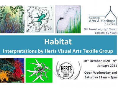 An imaginative exhibition based on the theme of Habitat by the Herts Visual Arts Textile Group featuring wide-ranging textile imagery from embroidery, weaving, feltwork, fabric printing and mixed media. Open on Wednesdays and Saturdays from 11am - 3pm. Workshops also being offered - see opportunities for details.