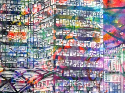 Debbie Ayles presents a painterly exploration of the myriad patterns found in architectural landscapes. Her paintings include all the shadows, reflections, sunbursts, clouds, people and chance elements, blending and blurring each aspect to create structural harmony, at once figurative and abstract.