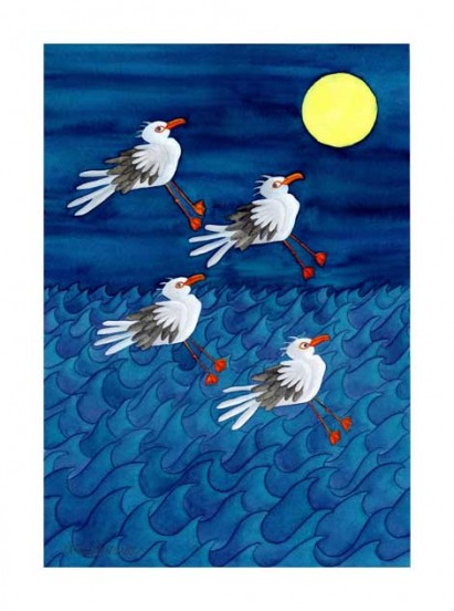 Seagulls come in for a nighttime crash landing was painted after I had been on a motor cruiser with an accident-prone friend. I have known Mark Adams since I was 2 and throughout his life he has caused his Mum reason for concern. He sledged down a snowy hill, crashing into rocks covered in cowpats and spent months in hospital with lacerated and infected injuries. He sailed a yacht from Holland, with a friend who had a serious heart problem, got caught in a storm, had to lash himself to the mast, whilst letting off flares, whilst his friend was down below and not feeling well. He was rescued by the RNLI 40 miles off the Lowestoft coast. Anyway, we cruised from Brixham to Dartmouth and, as we came into the river Dart, dusk was falling and all I can remember thinking was “Put the brakes on”! as he steered willy-nilly down a rather busy river. I have not been out on a boat with him since!