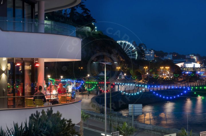 Dining out overlooking Abbey Sands at Bistrot Pierre by night.