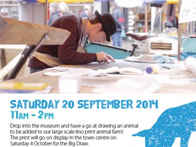 Drop into the museum and have a go at drawing an animal to be added to our large scale lino print animal farm! The print will go on display in the town centre on Saturday 4 October for the Big Draw.
